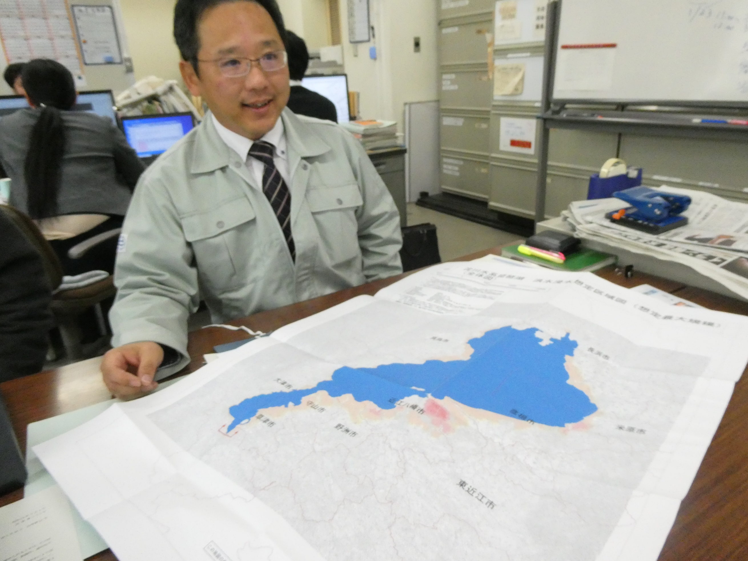 国や県が(洪水予報河川などの)大きい河川で出す「浸水想定区域図」、小さい河川も含めた「地先の安全度マップ」、土石流などのおそれのある場所を示す「土砂災害警戒区域」等、これらの『リスク情報』をもとに市町が作成するのが『ハザードマップ』。今回注目したのは、県が出すリスク情報の中に琵琶湖の洪水リスク情報も存在しているということです。